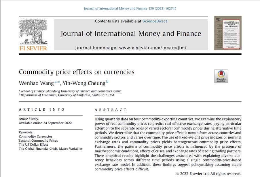 黄金娱乐城 教师王文浩作为第一作者与加州大学圣克鲁兹分校教授Yin-Wong Cheung合作的论文“Commodity price effects on currencies”,在期刊Journal of International Money and Finance在线发表(2022年9月)。该期刊为SSCI二区期刊,期刊最新影响因子为2.762,属我校A1类期刊。