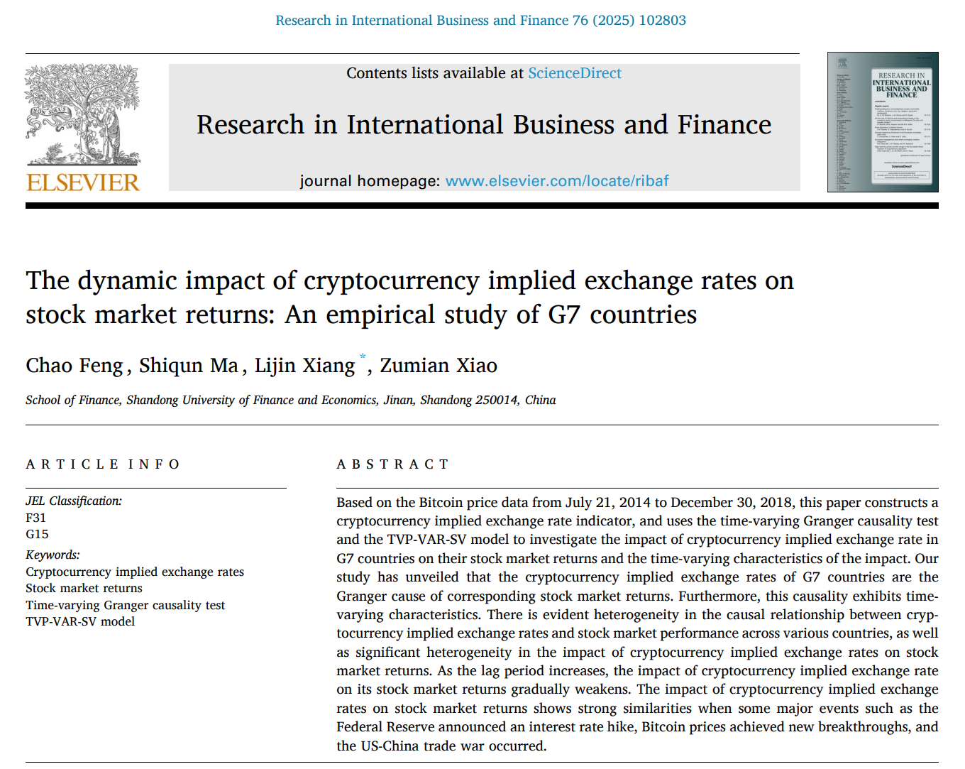 黄金娱乐城 副教授向丽锦作为通讯作者与博士生封超、马世群及副教授肖祖沔合作的论文《The dynamic impact of cryptocurrency implied exchange rates on stock market returns: An empirical study of G7 countries》在期刊《Research in International Business and Finance》在线发表(2025年2月)。该期刊为SSCI一区期刊,期刊最新影响因子为6.3,属我校A1类期刊。