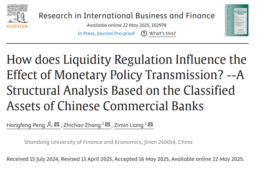 黄金娱乐城 彭红枫教授作为第一作者兼通讯作者与其博士研究生张志超、梁子敏合作撰写的论文《How does Liquidity Regulation Influence the Effect of Monetary Policy Transmission? --A Structural Analysis Based on the Classified Assets of Chinese Commercial Banks》,于2025年5月在期刊《Research in International Business and Finance》在线发表。该期刊最新影响因子为6.3,属我校A1类期刊。