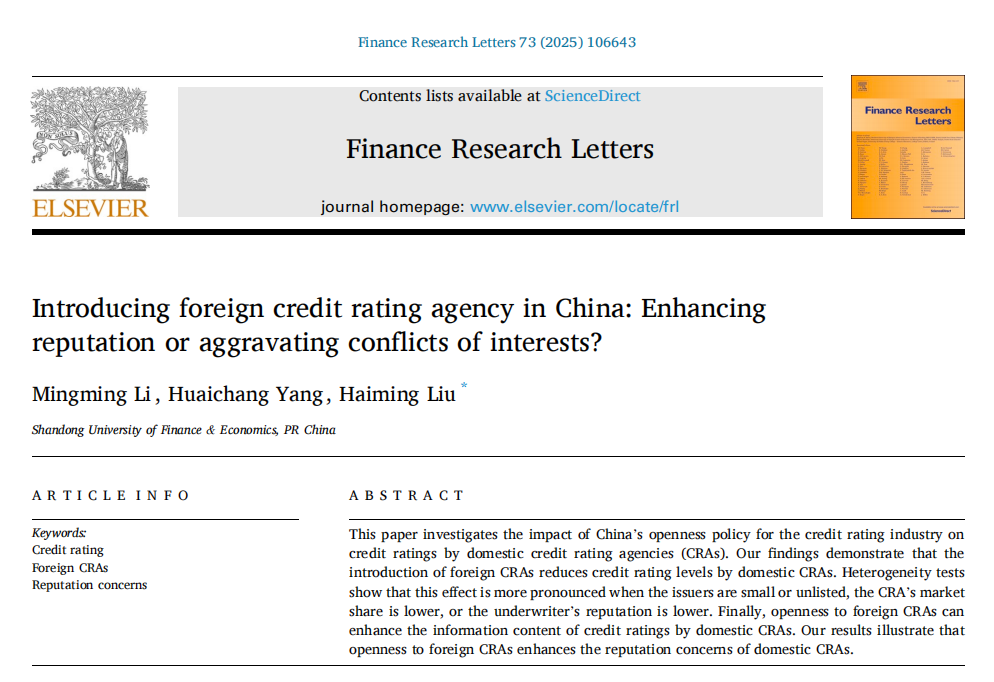 黄金娱乐城 副教授李明明作为第一作者与硕士研究生杨怀畅、山东财经大学金融发展研究院刘海明教授合作撰写的论文《Introducing foreign credit rating agency in China: Enhancing reputation or aggravating conflicts of interests?》在《Finance Research Letters》2025年第73卷(Volume 73, March 2025, 106643)发表。该期刊为SSCI一区期刊,期刊影响因子为7.4。