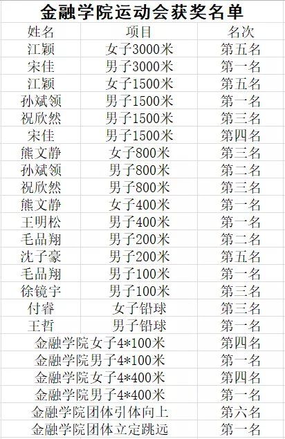 运动会上,我院学生方阵队列整齐、口号嘹亮、气势恢宏,展现了金融学子蓬勃朝气与青春活力,拉拉队员们热情洋溢为运动员加油助威。赛场上运动员们英姿飒爽、风驰电掣、坚韧顽强,以顽强的毅力和高超的竞技能力取得了令人满意的成绩,也为学院赢得了荣誉。观众热情饱满,加油呐喊声此起彼伏,鼓声掌声震耳欲聋,为运动员们提供了强大的精神力量,彰显了学院团结奋斗,奋勇争先精神风貌。最终,熊文静、王明松包揽了男女400米冠军;孙斌领、祝欣然、宋佳分别获得1500米一三四名;宋佳获得男子3000米冠军;毛品翔、徐镜宇获得“百米飞人”大战冠军和季军;男子团体斩获4×100米、4×400米冠军……