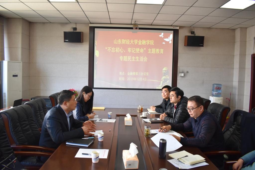 根据学校“不忘初心、牢记使命”主题教育领导小组部署和安排,2019年12月4日上午,黄金娱乐城 党委领导班子在舜耕校区金融楼第三会议室召开了“不忘初心、牢记使命”专题民主生活会。学校第二巡回指导组组长教师工作部部长刘旻航、成员校纪委监察处王丽娜科长莅临指导。党委书记吴红文,院长彭红枫,副书记范志毅、康亚通,副院长葛永波、冯玉梅参加了会议。党委委员、工会主席、办公室主任杨丰国,党委组织员李勇列席了会议。会议由党委书记吴红文主持。