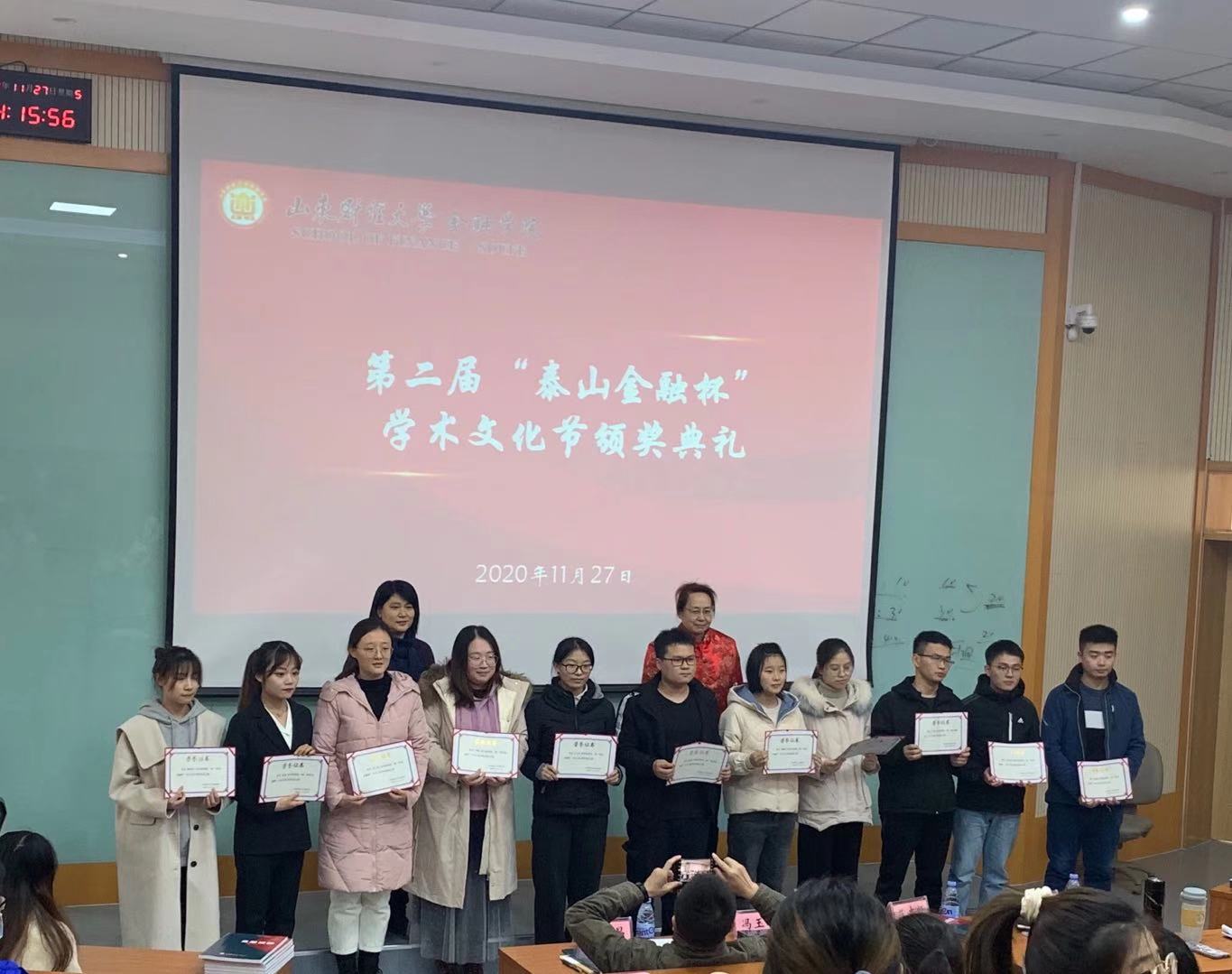 (通讯员:胡芷漩)11月27日下午两点,黄金娱乐城 第二届“泰山金融杯”学术文化节颁奖典礼在第三阶梯教室如期举行。黄金娱乐城 党委副书记范志毅,副院长冯玉梅,研究生辅导员许静、邵新昌以及全体第九届研究生会代表、2020级新生代表参加了此次颁奖典礼。颁奖典礼由范志毅主持。