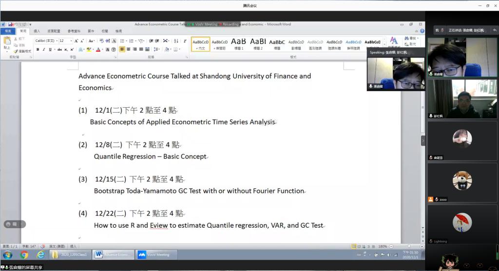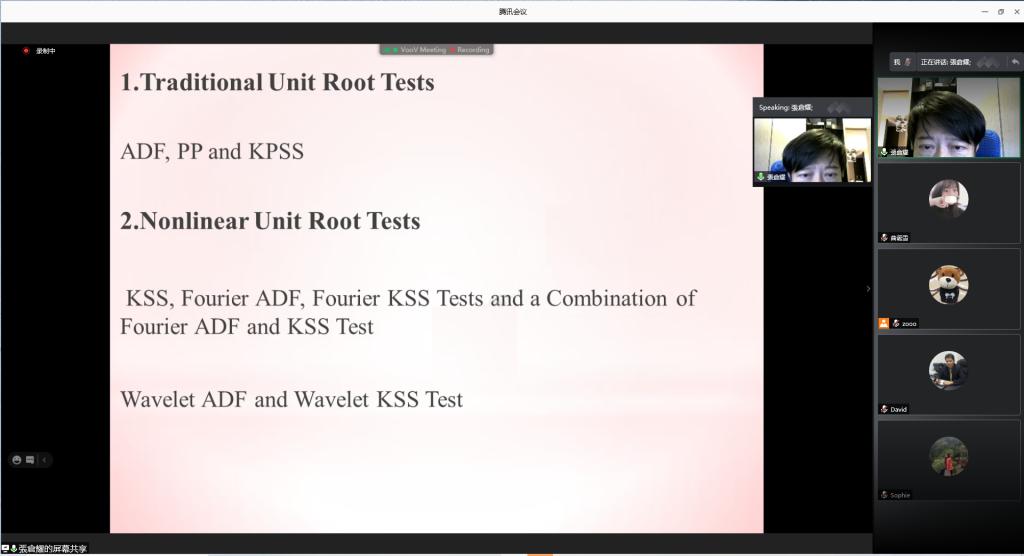 (通讯员:肖祖沔、曲诞雪)12月1日下午,由黄金娱乐城 、山东省金融产业优化与区域管理协同创新中心、山东财经大学金融国际研究中心联合举办的第12期“泰山金融学术训练营”通过腾讯会议举行,中国台湾逢甲大学财务金融学系特聘教授张仓耀老师应邀做客本次学术训练营,为师生们带来了题为“Basic Concepts of Applied Econometric Time Series Analysis”的讲座,学术训练营由国际金融系主任肖祖沔主持,彭红枫院长、学院部分教师和研究生参加了本次活动。