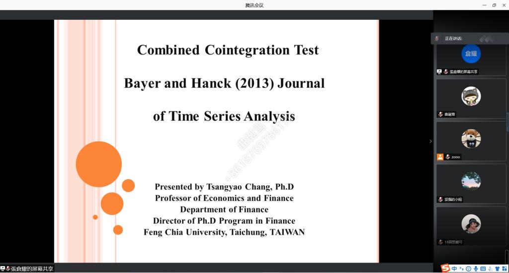 (通讯员:肖祖沔、曲诞雪)12月8日下午,由黄金娱乐城 、山东省金融产业优化与区域管理协同创新中心、山东财经大学金融国际研究中心联合举办的第14期“泰山金融学术训练营”通过腾讯会议举行,中国台湾逢甲大学财务金融学系特聘教授张仓耀老师应邀做客本次学术训练营,为师生们带来了题为“Quantile Regression – Basic Concept”的讲座,学术训练营由国际金融系主任肖祖沔主持,彭红枫院长、学院部分教师和研究生参加了本次活动。