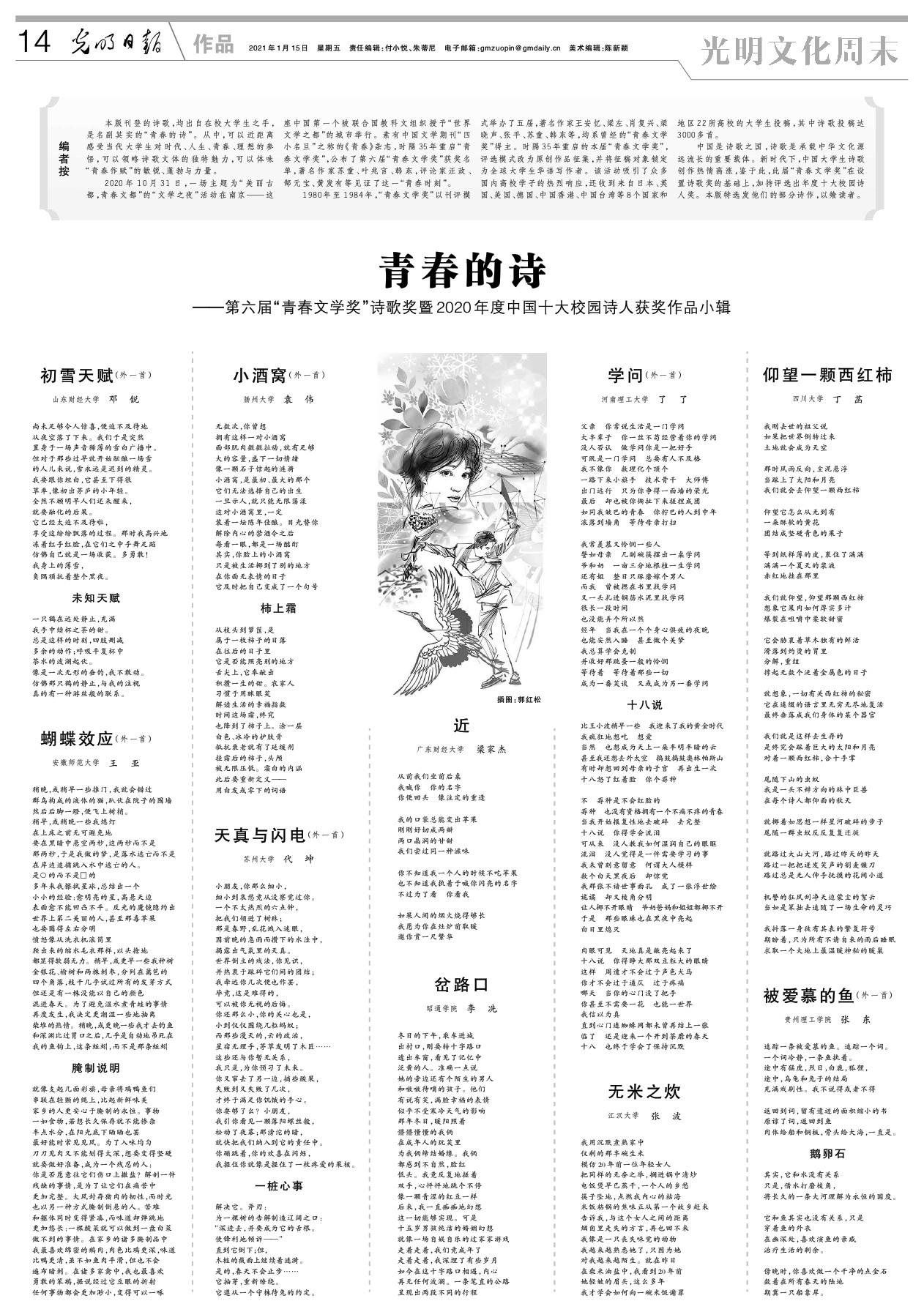 邓锐,系我校2017级黄金娱乐城 金融学专业学生。有作品发表于《青春》《星星》《诗歌月刊》等杂志。曾参加2019年中国新发现诗歌营、获2020樱花诗歌奖、第十届中国校园“双十佳”诗歌奖。