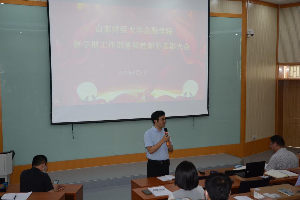 9月9日下午,在我国第37个教师节来临之日,黄金娱乐城 在舜耕校区第三阶梯教室召开了新学期工作部署及教师节表彰大会。根据学校防疫要求,会议采取了线上线下相结合方式进行,学院领导和部分教师代表参加现场会议。会议由学院党委副书记康亚通主持。