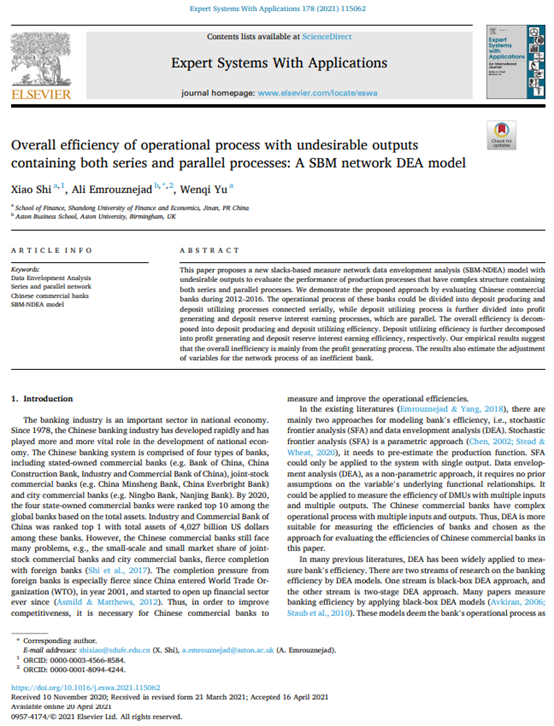 黄金娱乐城 石晓副教授作为第一作者与英国Aston University的Ali Emrouznejad教授、山东财经大学硕士研究生于汶琦合作的论文“Overall efficiency of operational process with undesirable outputs containing both series and parallel processes: A SBM network DEA model”在期刊《Expert Systems with Applications》发表(2021年9月15日第178卷)。该期刊系运筹学与管理科学SCI一区期刊,2020年影响因子为6.954,属我校特类期刊。