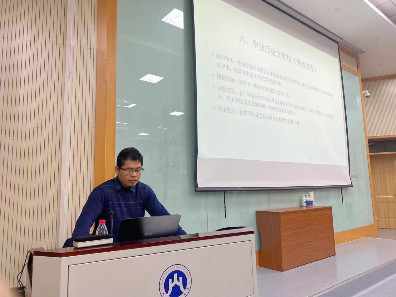 毕老师首先向同学们强调了学位论文格式规范的重要性,一个好的论文格式不仅可以使论文看起来简洁干练,更代表了研究生对于论文的态度。并告诫同学们随着学位论文评审难度的增加和毕业形势的严峻,同学们要根据自身情况对学位论文的撰写尽早做出规划,顺利完成毕业论文考核。随后,毕老师向同学们介绍了研究生学位论文写作规范事项、学术不端行为检测、学位论文匿名评阅、学位论文答辩、学位论文抽检复审等五项内容,并重点就最后论文答辩流程和抽检提出了针对性的指导建议。