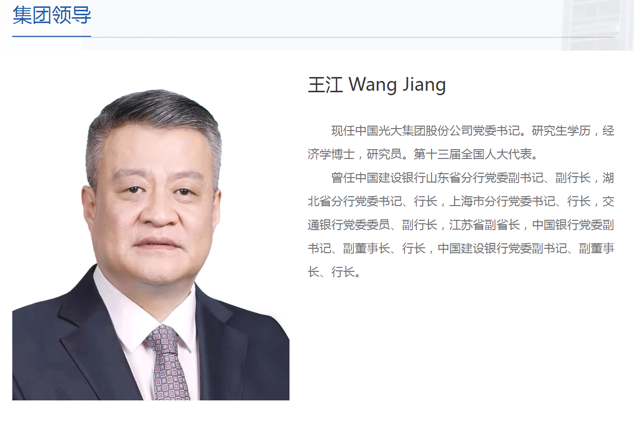根据中国光大集团官网消息:3月4日,中央组织部有关负责同志出席中国光大集团干部会议,宣布中央决定:王江同志任中国光大集团股份公司党委书记。