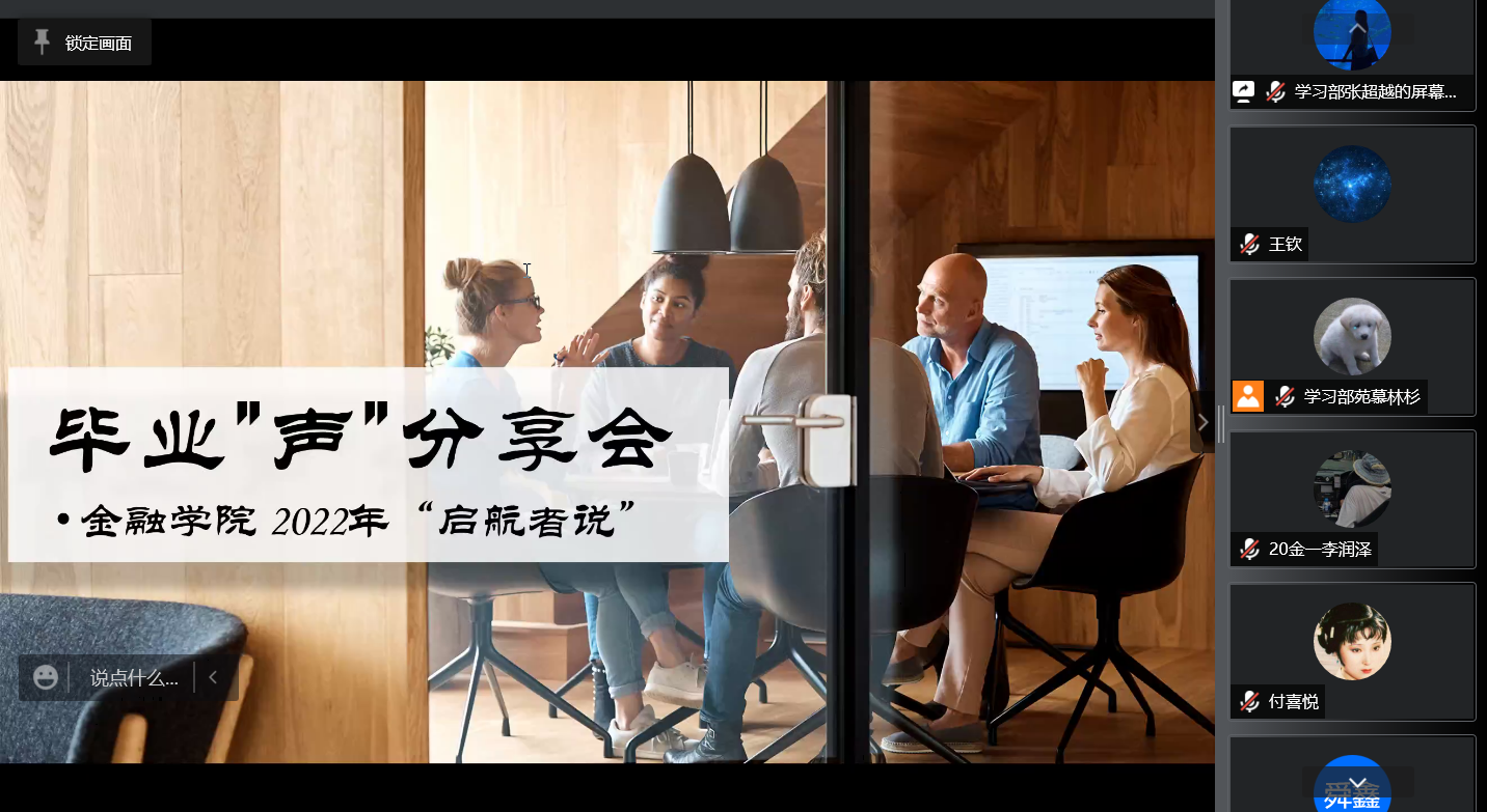 会上,邵老师希望同学们不仅能够学到备考、就业的准备方法更要学习优秀毕业生身上的奋斗精神和顽强意志,形成学院各年级“传帮带”的优良传统,踏实学习,理性选择,为自己的成长和前途负责。随后,参加分享的同学分别对当前就业形势、学习方法、备考安排与时间规划、心路历程、自我心理疏导等方面分别进行介绍,大家在线上空间分享着个人毕业季的紧张与忙碌、收获与不舍。张欣为大家分享了自己考入中央财经大学的经历,以及高效的学习方法和备考安排,让同学们有明确的时间规划;刘亚东以风趣幽默的方式激励大家在本科阶段要努力奋斗,为自己的将来搏取一个无悔的结果,向着更高层次迈进;徐海鑫分析了目前就业形势,重点分享了工作面试时的心态和方法;徐钧文有条不紊,沉着稳重,结合自身考研经历详细地分享各科目的复习方法,为那些仍处在迷茫之中复习备考的同学们点亮了一盏明灯;王潇则重点分享了考研过程中该如何有效地进行复习和准备;高鋆泽通过自身发生的趣事讲述自己的考研道路,让同学们明白心态的重要性,激励同学们永远不要放弃。