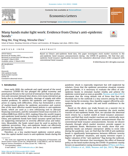 黄金娱乐城 石宁讲师(第一作者)与王营副教授和陈文哲副教授(通讯作者)合作撰写的论文《Many hands make light work:Evidence from China’s anti-epidemic bonds》在《Economics Letters》2022年第214卷发表。该期刊属于我校A1期刊。