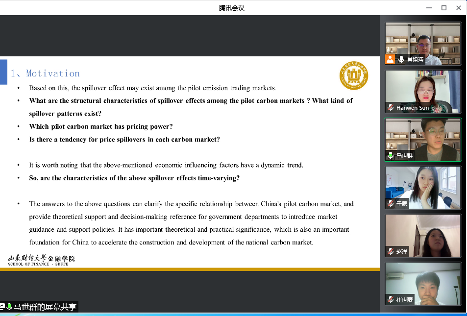 论文汇报讨论环节中,孙汉文副教授担任点评人,文章汇报人有马世群、于露、崔世豪以及赵洋四位同学。首先,马世群汇报了论文《Time-varying Spillovers among Pilot Carbon Emission Trading Markets in China》,该文运用TVP-VAR-CONNECTEDNESS方法构建了时变溢出指数,对中国试点碳市场的一体化程度及其动态变化,各试点碳市场碳价收益率的动态溢出路径、溢出关联结构、市场定价权以及溢出模式进行深入探讨,得出北京与重庆碳市场为主要溢出市场,广东与天津碳市场为主要溢入市场,并且市场间的溢出模式具有较强的时变性特征等结论。孙汉文副教授从文章的研究动机、实证内容的具体解释以及结论的经济意义等方面给出了专业的指导建议。