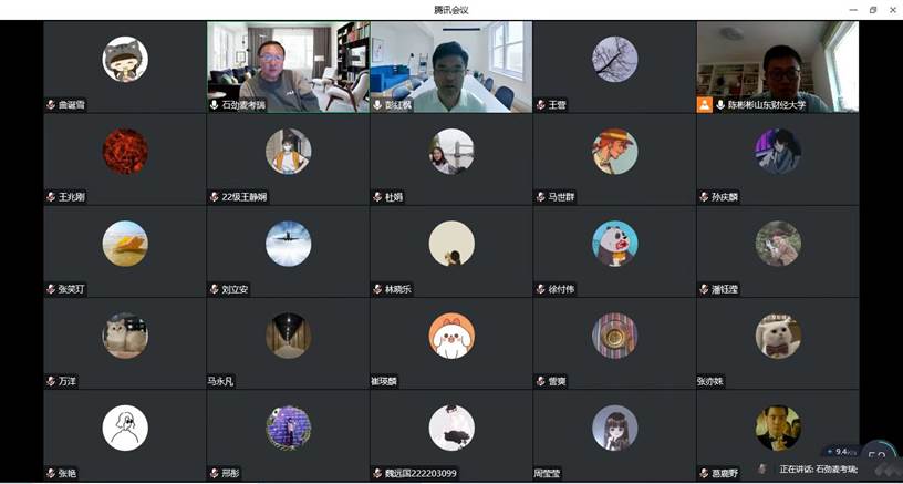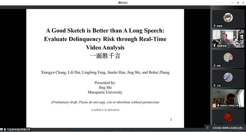 (通讯:陈彬彬)9月29日,由黄金娱乐城 、山东财经大学金融国际研究中心和山东省金融产业优化与区域管理协同创新中心共同主办的第27期“泰山金融论坛”在云端举行。澳大利亚麦考瑞大学商学院教授、山东财经大学特聘教授石劲老师应邀做客本次论坛并分享最新研究成果。本次论坛题目为“A Good Sketch is Better than A Long Speech: Evaluate Delinquency Risk through Real-Time Video Analysis”,由金融科技系副主任陈彬彬主持。黄金娱乐城 院长彭红枫、副院长王营、部分教师及研究生参加了此次论坛。