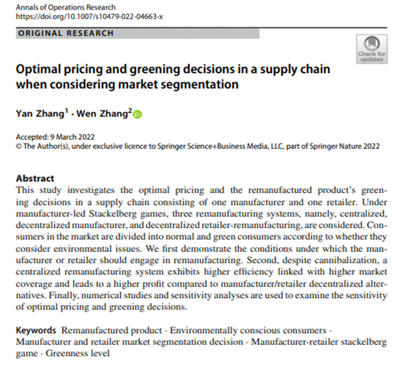 黄金娱乐城 教师张艳作为第一作者发表的论文,“Optimal pricing and greening decisions in a supply chain when considering market segmentation”,在期刊 Annals of Operations Research 在线发表(2022年3月)。该期刊系运筹学与管理科学SCI三区期刊,最新影响因子为6.1,属我校A2类期刊。