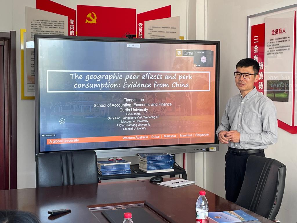 7月7日上午,澳大利亚科廷大学(Curtin University)经济与黄金娱乐城 罗天培博士受邀访问黄金娱乐城 ,并作了题为“The geographic peer effects and perk consumption: Evidence from China”的学术报告。会议由黄金娱乐城 副院长王营教授主持,黄金娱乐城 部分教师和学生通过线上线下方式参加会议。