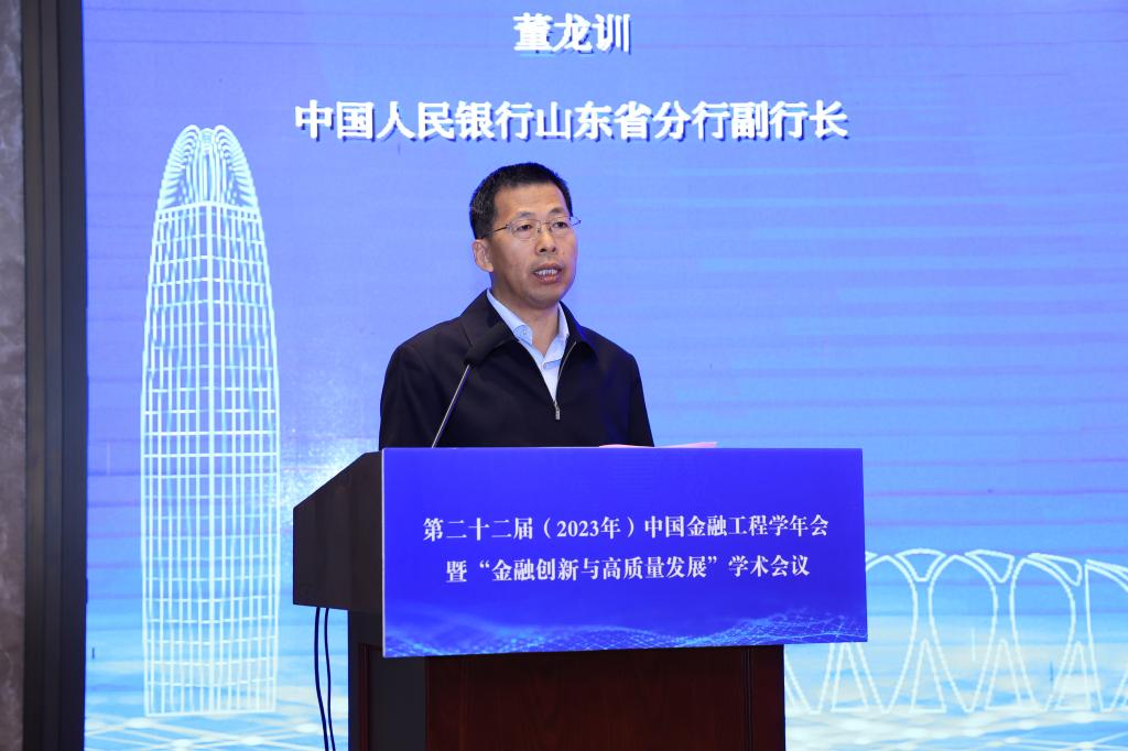 中国人民银行山东省分行董龙训副行长代表山东省金融学会向与会人员发表了热情洋溢的致辞。他对本次年会的召开表示了热烈的祝贺,并对所有一直关心和支持山东省金融业改革与发展的专家学者表达了深深的感谢。他强调,近年来,人民银行将焦点放在推进金融供给侧结构性改革上,不断优化和完善货币政策调控机制,着力于发展普惠金融、绿色金融和科创金融,以提升金融服务实体经济的效率和质量。同时,山东省金融学会注重汇聚各界专家学者的真知灼见,在引领山东省金融发展和推动金融创新突破中发挥了积极作用。他希望与会专家学者充分发挥科研专长和专业知识,加强对经济金融理论的基础研究,加强对全国和山东省重大经济金融问题的跟踪研究,以及对山东省破解绿色低碳高质量发展的制约因素进行政策研究,以提供更多的理论支撑和智力建议。