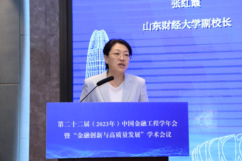 山东财经大学副校长张红霞教授代表山东财经大学对与会领导和专家学者的到来表示热烈欢迎和衷心感谢。在致辞中,张红霞重点介绍了学校围绕全面建成高水平财经特色名校这一目标,在学科专业、师资队伍、科学研究、人才培养、社会服务以及国内外合作交流等方面所做出的努力。她指出,本次年会将为山东财经大学深度推进高质量发展和金融学科的特色发展蓄势赋能。她希望与会专家学者深入交流,共同推动金融工程学科的高质量发展。