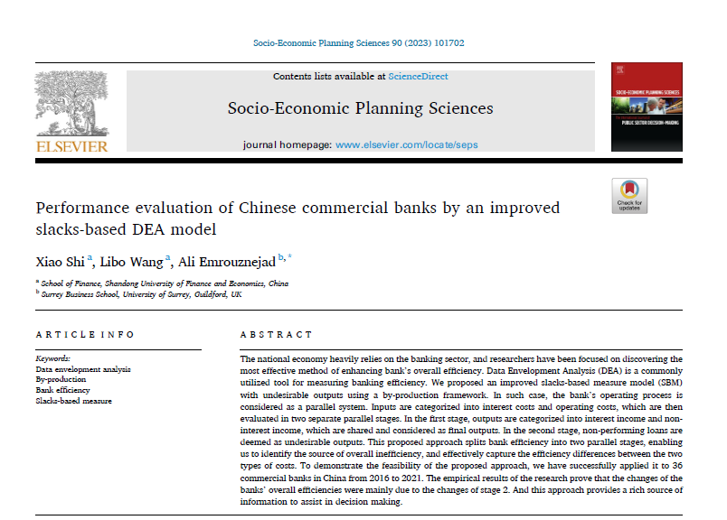 黄金娱乐城 石晓副教授作为第一作者与硕士研究生王利波、英国萨里大学Ali Emrouznejad教授合作的论文“Performance evaluation of Chinese commercial banks by an improved slacks-based DEA model”在期刊Socio-Economic Planning Sciences正式发表(2023, Vol. 90, Issue: Dec)。该期刊为SSCI一区期刊,期刊最新影响因子为6.1,属我校A1类期刊。