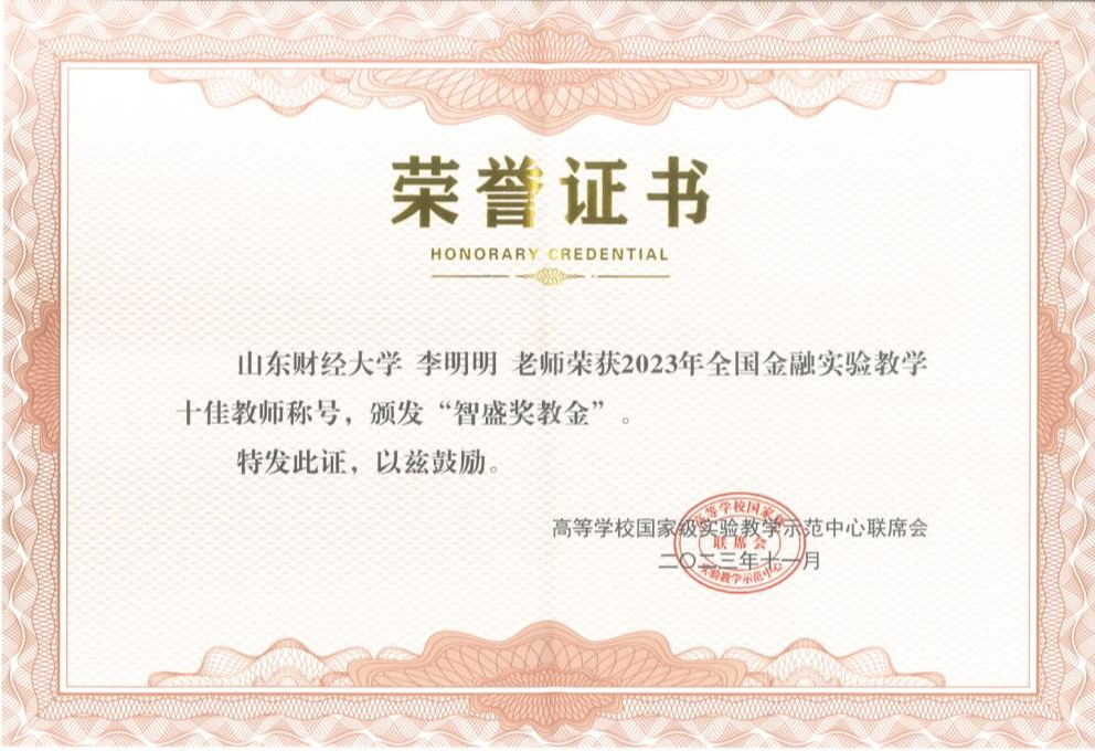 全国高校金融实验教学“智盛奖”优秀教师评选活动由国家级实验教学示范中心联席会经济与管理学科组发起,每年从全国一百多所高校长期从事金融实验教学任务的一线教师中选拔,经专家组匿名评审选出10名优秀教师予以奖励。旨在“弘扬先进,树立典型,表彰为金融学科实验教学建设做出特殊贡献的教师或实验管理人员,激励高校教师及实验管理人员努力投身于金融学科实验教学的建设与改革事业”。黄金娱乐城 继2017年王俊籽老师、2018年马孝先老师、2020年崔越老师、2021年石晓老师获得该项殊荣后,这是第五次获得该奖项,既是对黄金娱乐城 实验教学方面取得成绩的一种肯定,也表明黄金娱乐城 实验教学水平居于国内高等经管类院校的前列。