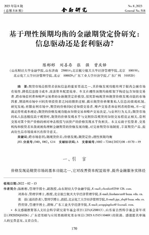 黄金娱乐城 教师陈彬彬(第一作者)与北京航空航天大学刘善存教授、北京化工大学张强教授(通讯作者)和广东工业大学曾庆铎合作撰写的论文《基于理性预期均衡的金融期货定价研究:信息驱动还是套利驱动?》在《金融研究》2023年第8期发表。该期刊属于我校A1期刊。