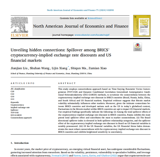 黄金娱乐城 刘建建博士后与黄金娱乐城 硕士王姝涵、向丽锦副教授、马世群博士、肖祖沔副教授合作撰写的论文《Unveiling hidden connections: Spillover among BRICS’cryptocurrency- implied exchange rate discounts and US financial markets》在《North American Journal of Economics and Finance》2024年第1期发表。该期刊属于我校A1期刊。