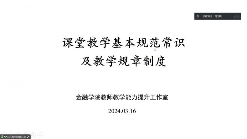 新学期伊始,为培养和提升新入职青年教师的教学能力,黄金娱乐城 教师教学能力提升办公室于2024年3月16日举办了以《课堂教学基本规范常识及教学规章制度》为主题的线上座谈会。本次座谈会由我院教学、管理经验丰富的冯玉梅教授主讲,近两年新入职青年教师与会。