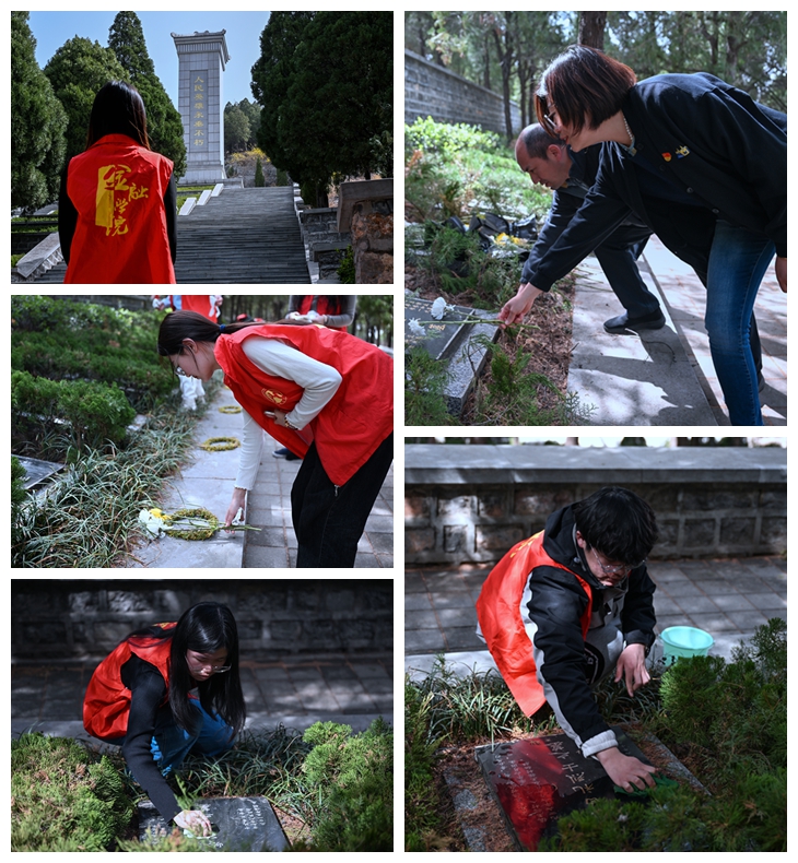 青山埋忠骨,山河念英雄。全体成员手持菊花,有序来到烈士墓碑前,整理清洁烈士墓碑周边环境并献上花束,肃立默哀,表达了对革命烈士的深切追思与无限哀悼。