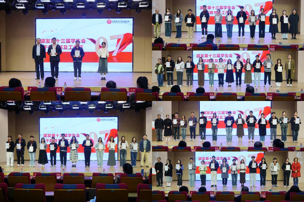 会上,吴红文、康亚通为第十二届优秀学生会干部及先进部门、先进个人颁发荣誉证书。全体辅导员颁发第十三届学生会干部聘书及工作证。