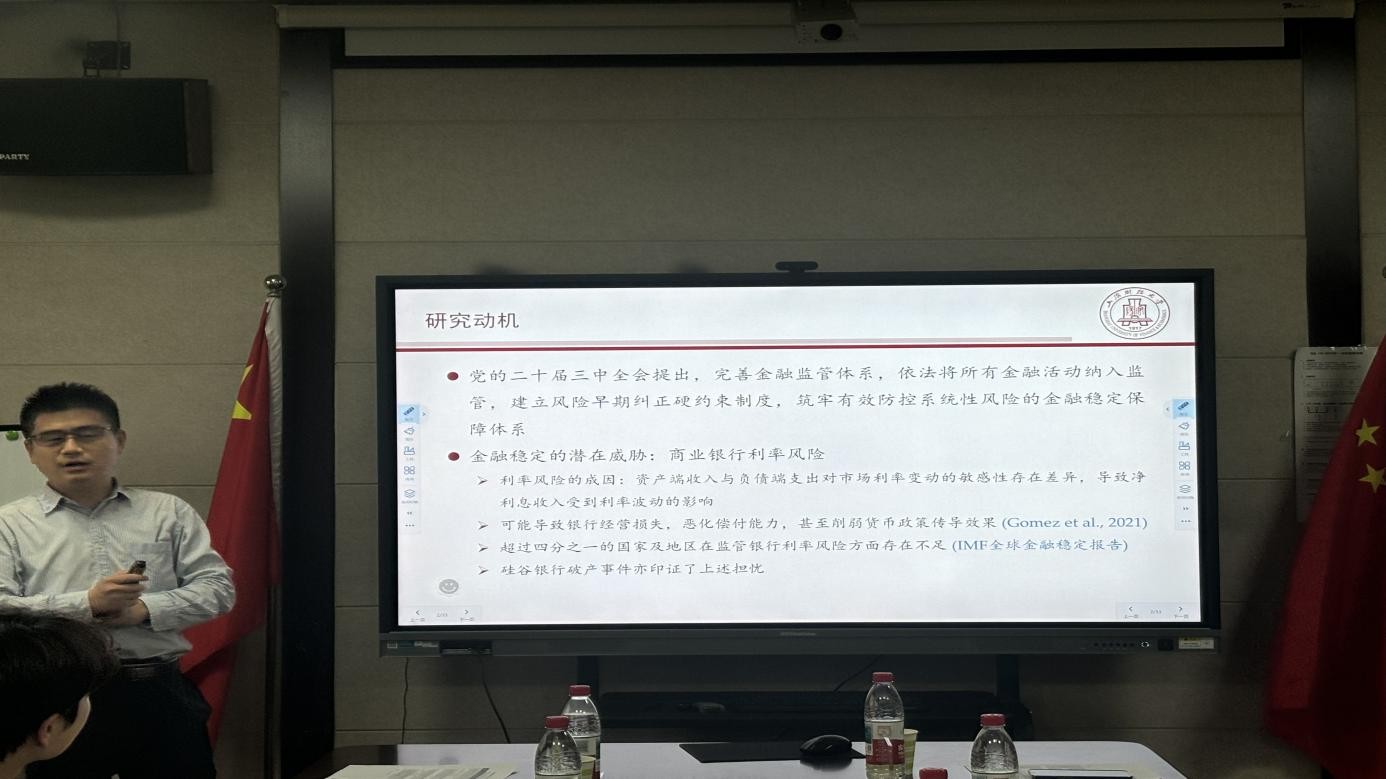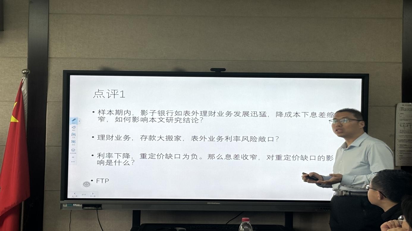 上海财经大学刘冲教授报告的题目是《利率市场化与商业银行利率风险测度有效性》。论文对利率风险计量指标(重定价缺口)的有效性与衍生品风险管理的效果进行实证分析。山东财经大学石宁副教授从表外业务、息差缩窄、银行异质性等方面提出建议。