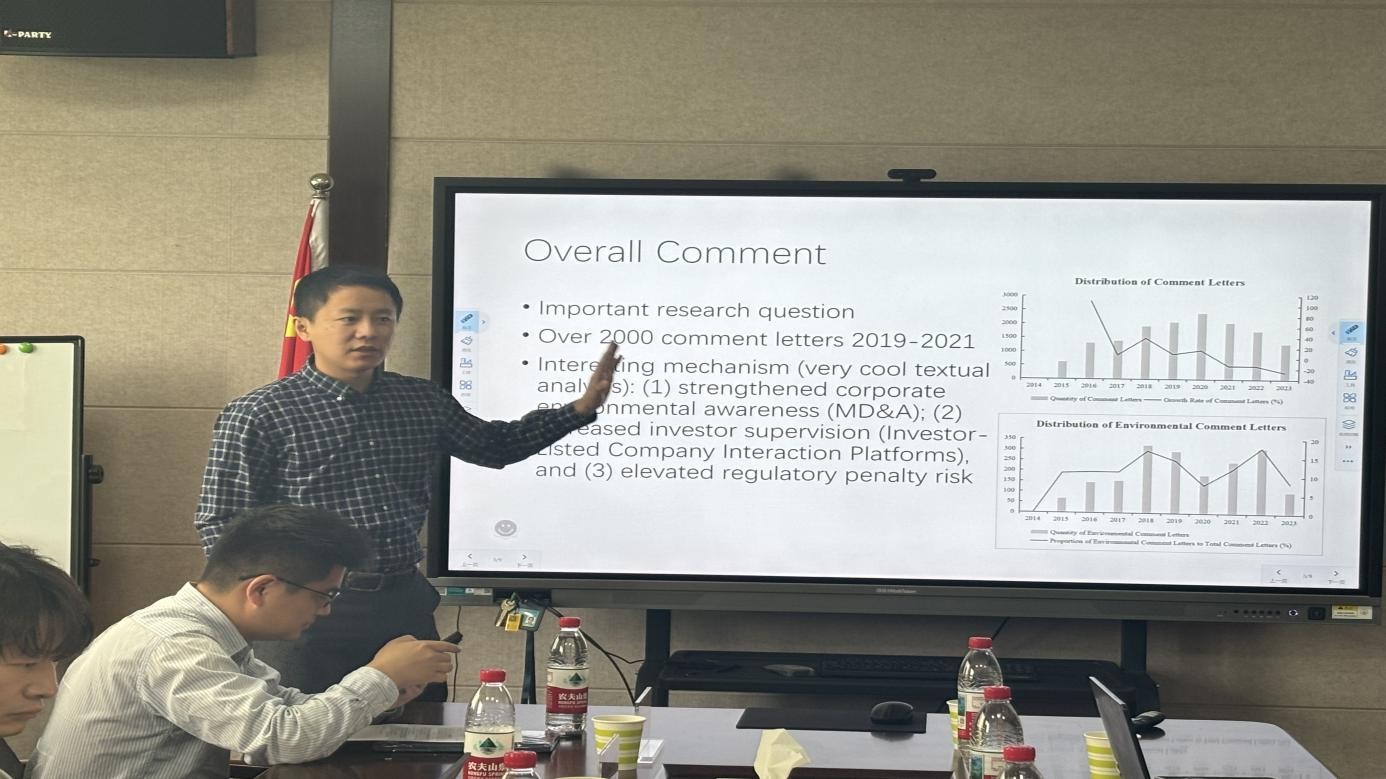 山东财经大学薛慧丽博士报告的题目是《Do Environmental Comment Letters Promote Green Innovation: Evidence from China》。文章发现,环境监管问询函能够促进企业绿色创新,强度越大促进作用越强,同时监管问询函不仅帮助外部投资者识别企业环境风险,也为政府监管提供相应的证据。香港浸会大学邹昆儒博士从考虑投入以及企业污染物排放的影响、问询函类型、问询动机等方面提出建议。