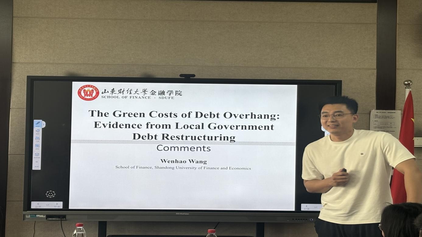 中央财经大学彭俞超教授报告的题目是《The Green Costs of Debt Overhang: Evidence from Local Government Debt Restructuring》。文章主要研究债务问题如何影响环保、以及债务重组对环境的作用。文章发现,债务置换使空气质量提升,尤其在事前债务高的地方尤为明显。山东财经大学王文浩副教授从中国经验的适用性、政策的滞后性以及时间节点的选择等方面提出建议。