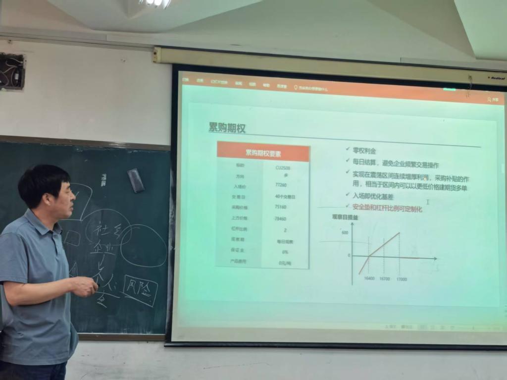 最后,杨延飞老师带来了关于累购期权的精彩分享。他从其产生背景与设计原理出发,详细讲解了该工具如何通过设定目标价格区间与分阶段执行机制,帮助企业实现稳健的风险对冲与利润锁定。同时,他还结合外汇交易与商品价格波动的典型场景,展示了累购期权在复杂市场环境下的灵活性与前瞻性应用。杨老师基于讲座内容抛出的案例思考,也进一步激发了同学们的探索欲。
