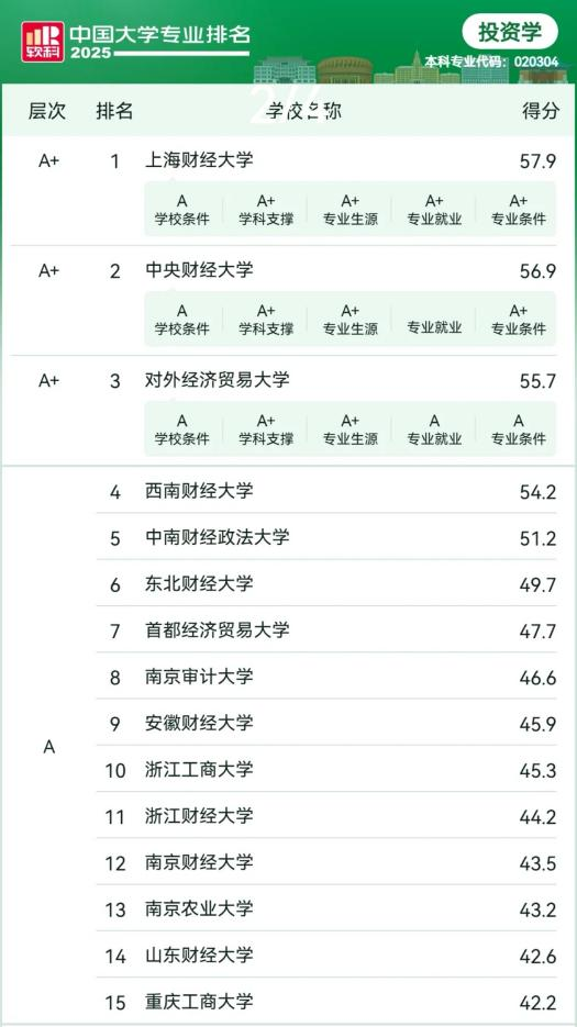 在“2025软科中国大学专业排名”里,黄金娱乐城 交出了一份亮眼的成绩单。学院的金融学、金融工程、投资学、金融科技四个专业都成功跻身A层次,金融学专业位列第35名,金融工程专业位列第24名,投资学专业位列第14名,金融科技专业位列第13名。