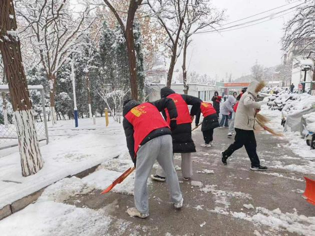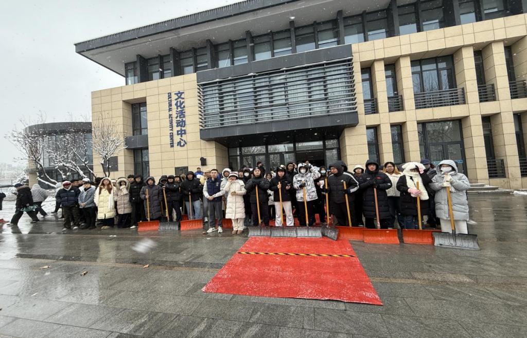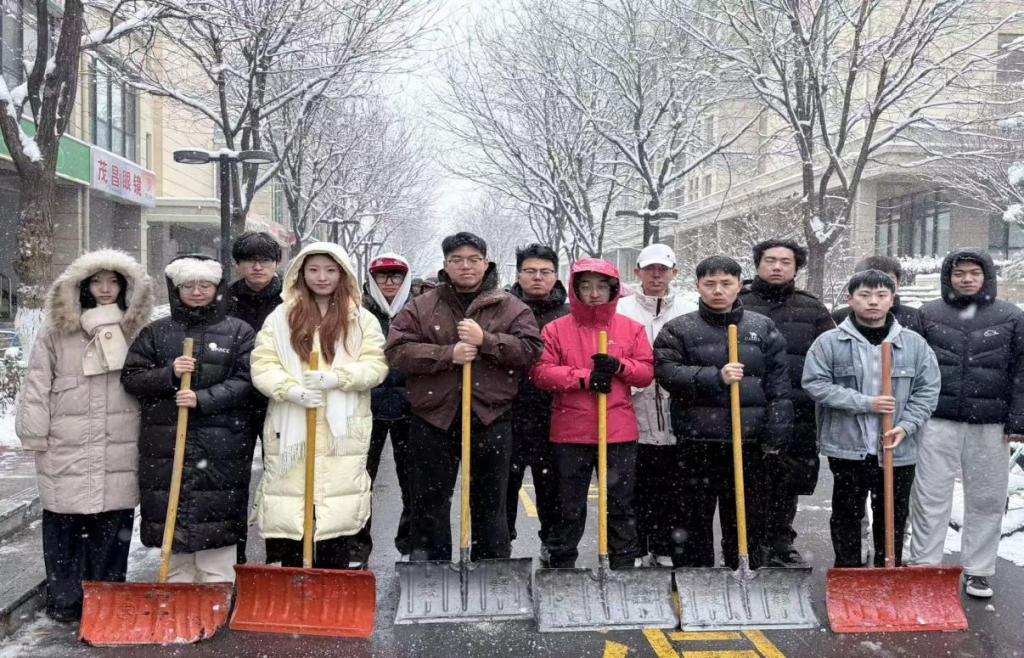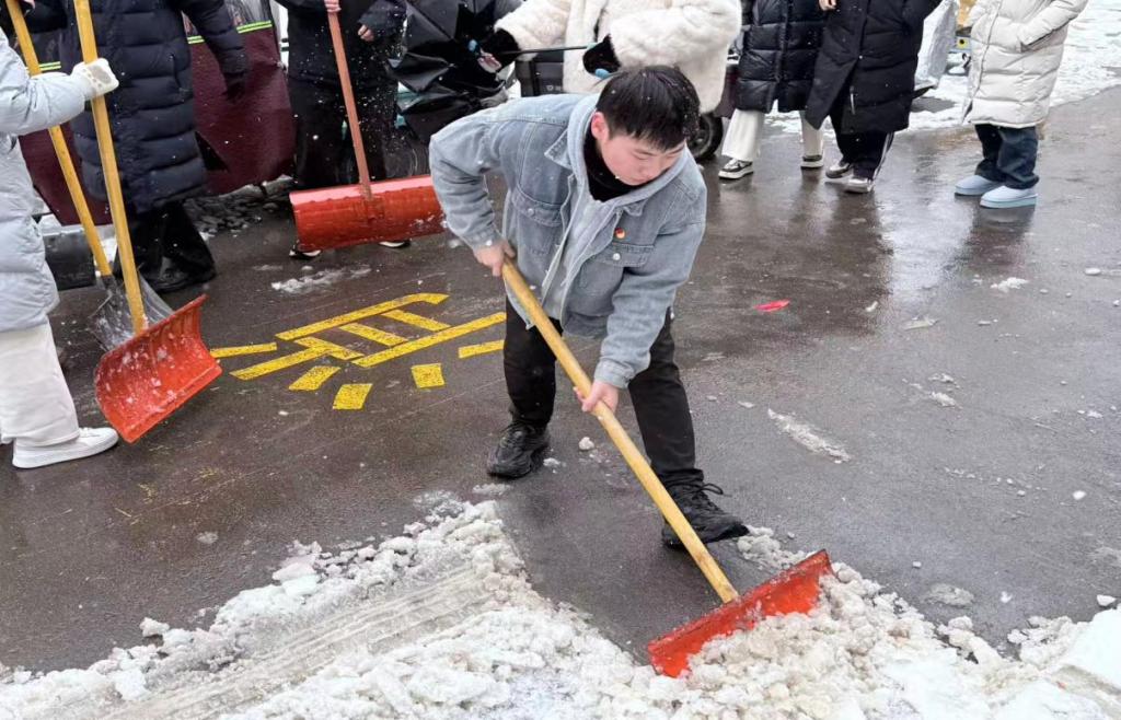 在章丘校区,研究生与本科生组成的扫雪队伍迅速集结。学生党员们佩戴党徽、冲锋在前,学生干部主动扛起重活累活,大家手持铁锹、扫帚等工具,对教学楼出入口、宿舍区通道、校园主干道等重点区域展开全面清扫。同学们分工协作、默契配合,尽管寒风凛冽、积雪溅湿裤脚,但每个人脸上都洋溢着坚毅的笑容,青春的身影在皑皑白雪中格外耀眼。
