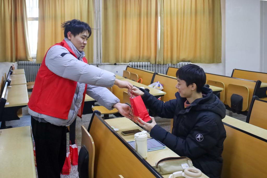 活动进程中,一支由师生志愿者组成的“送暖小队”穿梭于舜耕校区图书馆和教学楼之间,他们轻缓有序地将一份份暖心礼包放置于正在奋笔疾书的学子桌角,以“无声的陪伴”传递着深切的关怀。收到意外惊喜的同学们陆续抬头,眼中闪过惊喜。有人当即展开附带的贺卡仔细阅读,疲倦的面容上浮现出会心的微笑;也有人将寓意“心想事成”的橙子轻置于复习资料旁,仿佛从中汲取到一份新的鼓舞。