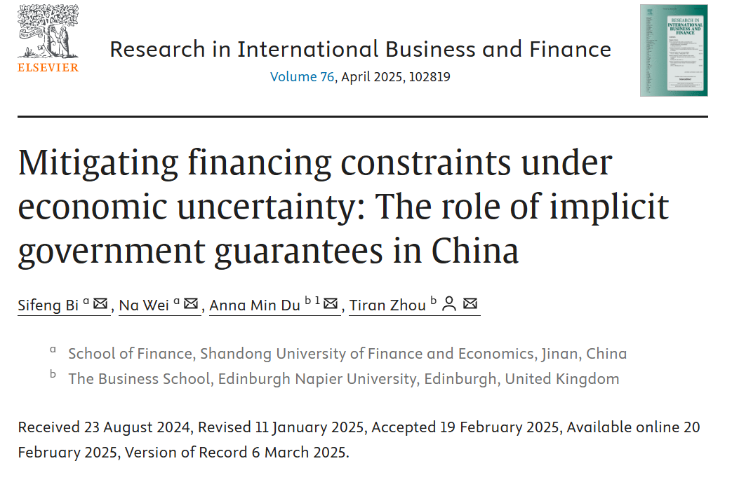 黄金娱乐城 毕泗锋教授作为第一作者与硕士生魏娜、英国Edinburgh Napier University的Anna Min Du教授以及Tiran Zhou助理教授合作的论文“Mitigating financing constraints under economic uncertainty:The role of implicit government guarantees in China”在期刊《Research in International Business and Finance》2025年第76卷(Volume 76, April 2025, 102819)发表。该期刊为SSCI一区期刊,期刊最新影响因子为6.3,属我校A1类期刊。