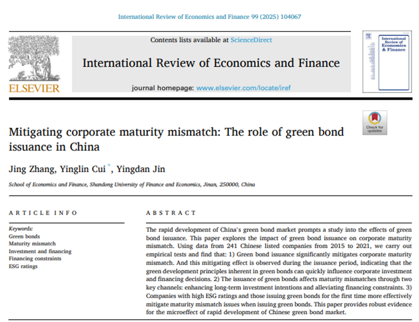 黄金娱乐城 教授张晶作为第一作者与博士研究生崔瑛麟、硕士毕业生靳英丹(现为西南财大博士研究生)合作撰写的论文《Mitigating corporate maturity mismatch: The role of green bond issuance in China》在《International Review of Economics & Finance》2025年第99卷(Volume 99, April 2025, 104067)发表。该期刊为SSCI一区期刊,期刊影响因子为4.8,该期刊属于我校A2类期刊。