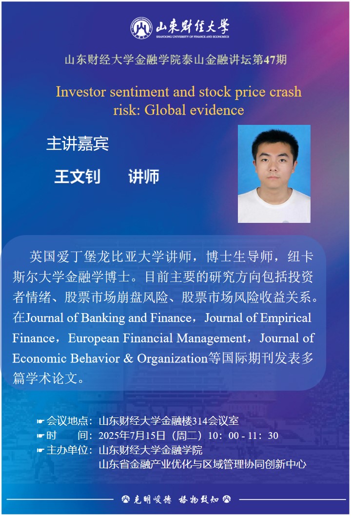 王文钊,英国爱丁堡龙比亚大学讲师,博士生导师,纽卡斯尔大学金融学博士。目前主要的研究方向包括投资者情绪、股票市场崩盘风险、股票市场风险收益关系在Journal of Banking and Finance, Journal of EmpiricalFinance, European Financial Management, Journal ofEconomic Behavior & Organization等国际期刊发表多篇学术论文。