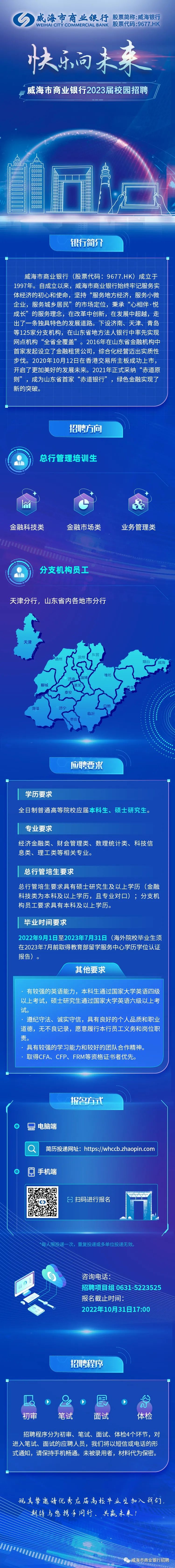 威海市商业银行面向23届应届毕业生开启校园招聘,要求与简章如下: