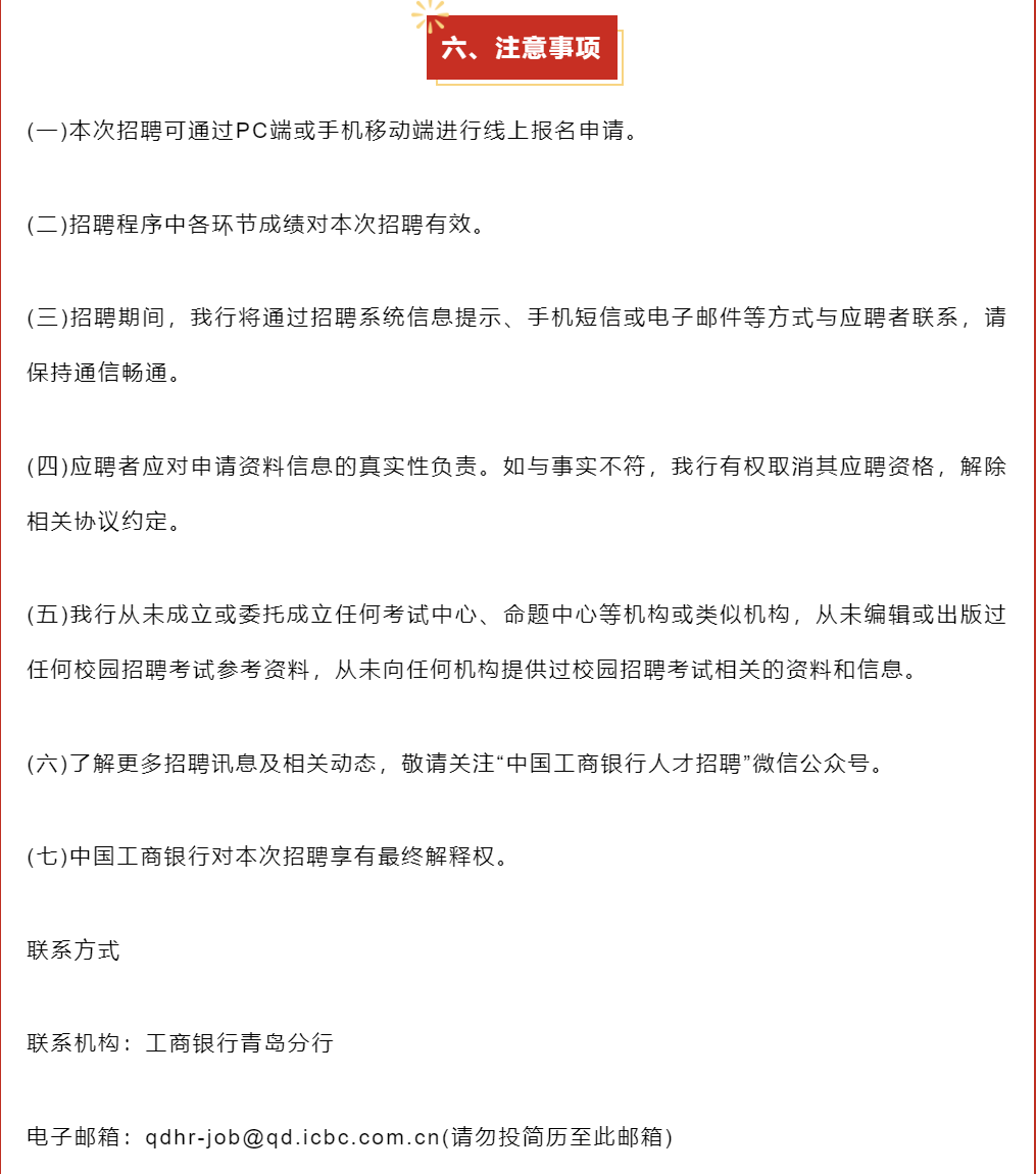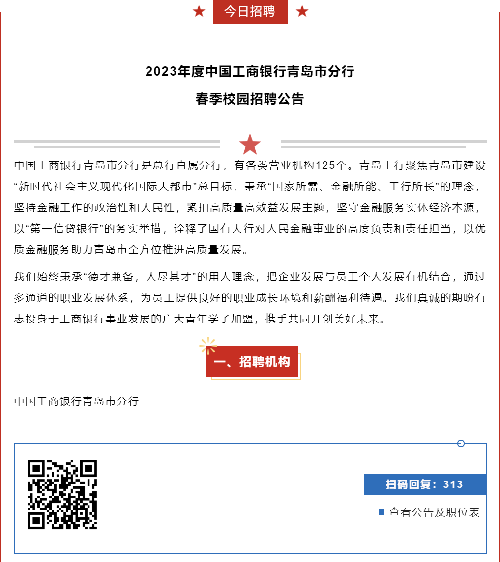 工商银行青岛分行公开招聘!共计180人!