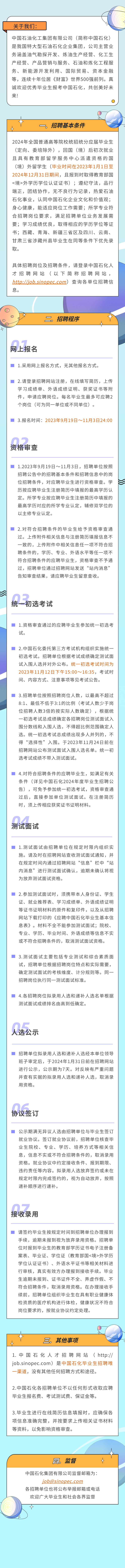 作为此次招聘的唯一渠道,中国石化招聘网站(//job.sinopec.com)于今日起正式接收毕业生网上投递简历,报名时间截至2023年11月3日。