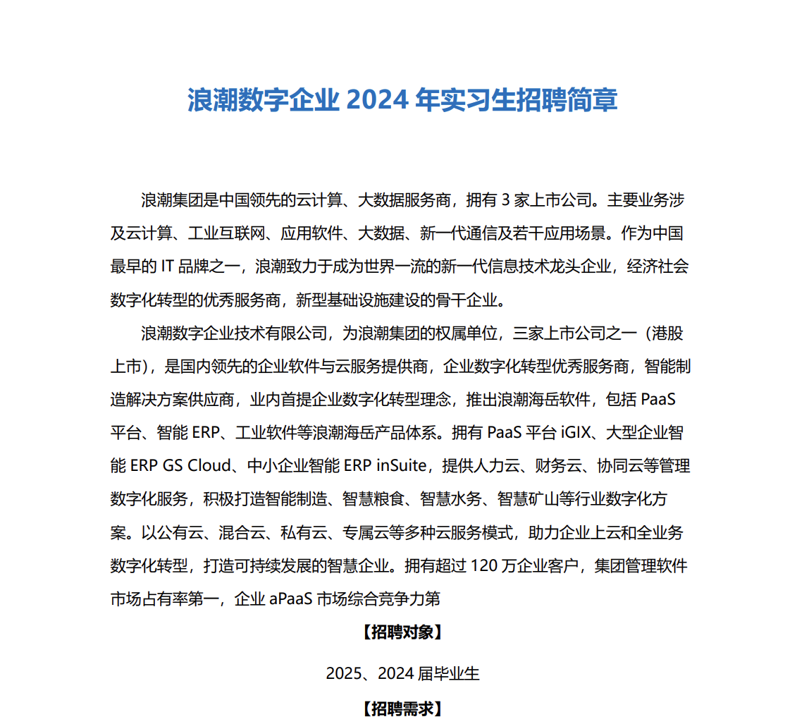 浪潮数字企业 2024 年实习生招聘