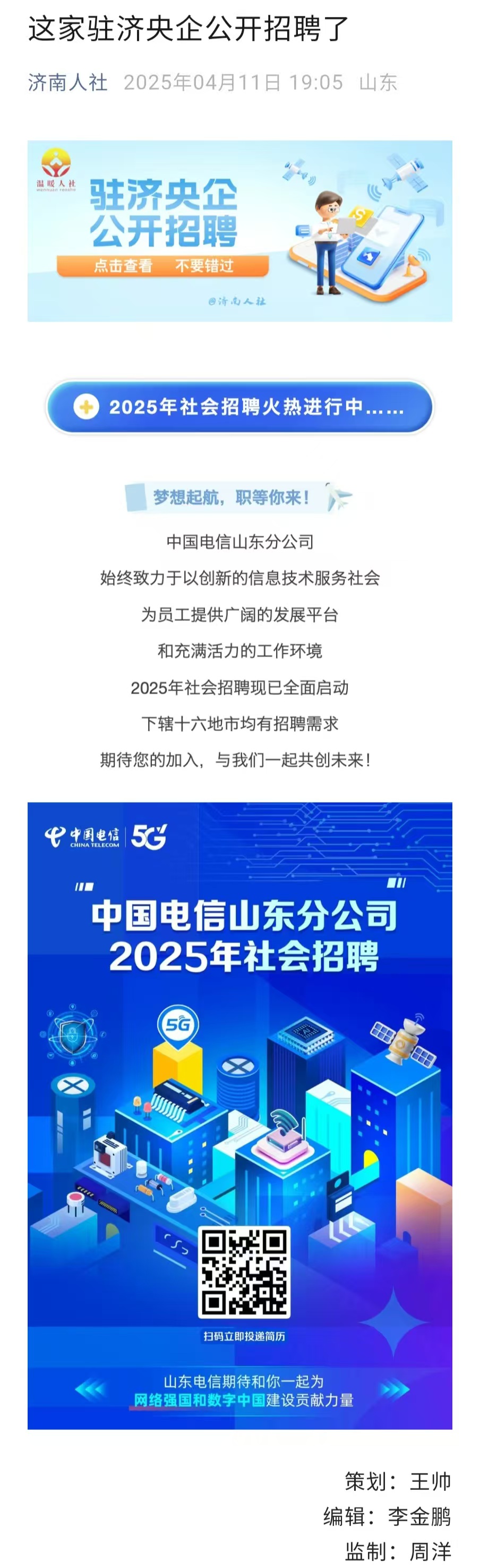中国电信山东分公司2025年社会招聘