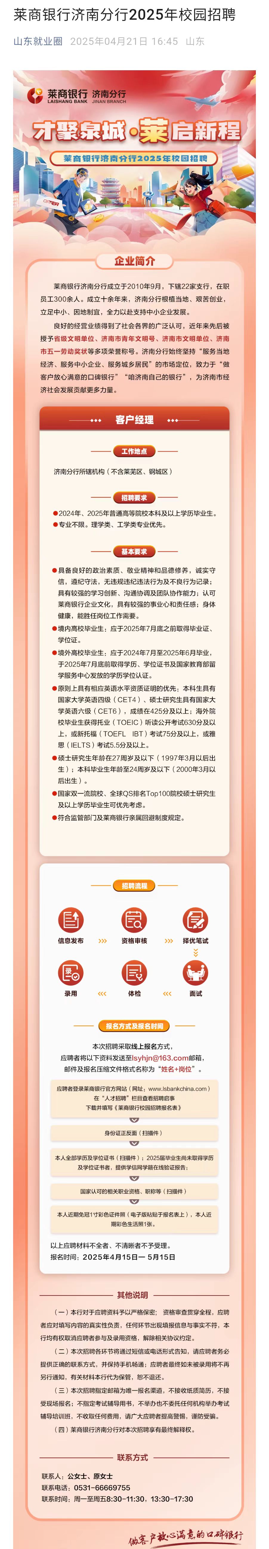 莱商银行济南分行2025年校园招聘