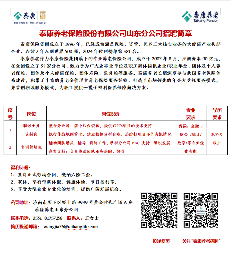 泰康养老保险股份有限公司山东分公司招聘简章