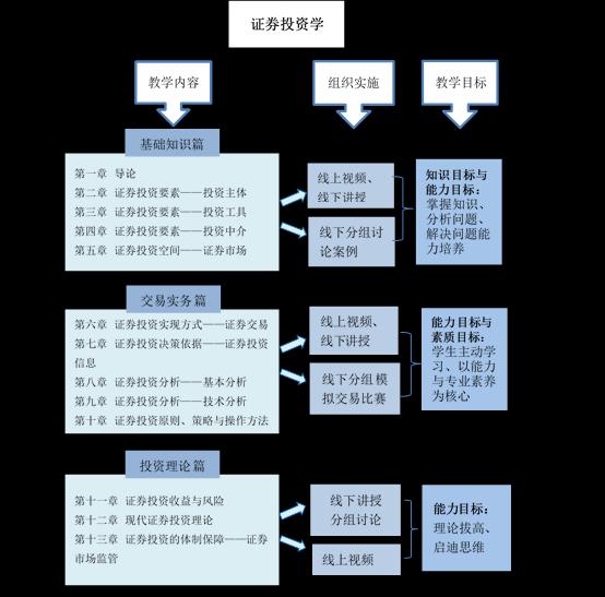 我院金融学专业已入选国家一流本科专业建设点,作为金融学专业的主干课、核心课之一,本课程的教学目标为: ①知识目标。使学生掌握证券投资基本概念、理论体系,以及分析框架与方法,熟悉证券市场在整个金融市场中的地位与作用,了解我国证券市场的建设历史与发展现状、全球证券市场发展特点与最新发展趋势。②能力目标。使学生掌握证券市场基本规律、证券投资基本策略与分析方法,培养观察证券市场现实问题的能力,以及深入分析问题、解决复杂问题的能力。③素质目标。立德树人,帮助学生正确认识证券投资中的风险与收益,树立风险防范意识,形成科学投资理念与风险底线思维,引导学生树立科学的理财观、价值观、风险观,具备能够胜任证券投资实操及进行相关理论分析研究的、系统而全面的专业素养。