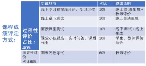 为适应教学改革需要,激发学生学习热情,课程采用过程性评价与结果性评价相结合、线上线下考核结合,细化考核节点,给学生平时学习“ 增负”,从课前、课中、课后的考核评价中全面考核学习效果。课程采用线上学习、在线讨论和学习习惯(10%)+线上章节测试(10%)+面授课堂测试(10%)+小组讨论和翻转课堂(10%)+期末考试(60%)的方法计算成。在期末考核中,剔除试卷中的老旧题型,提升应用型、开放性试题占比。