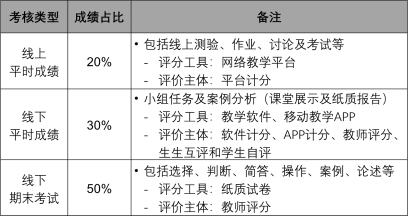 本课程对学生的学业评价采用线上/线下融合,过程性评价/终结性评价相结合的多元化考评模式(见下表)。总评成绩=线上成绩(20%)+线下平时成绩(30%)+线下期末考试(50%)。课程成绩基于多元化的评分工具和评价主体。考题类型轻“记忆、背诵”,重“分析、应用”。