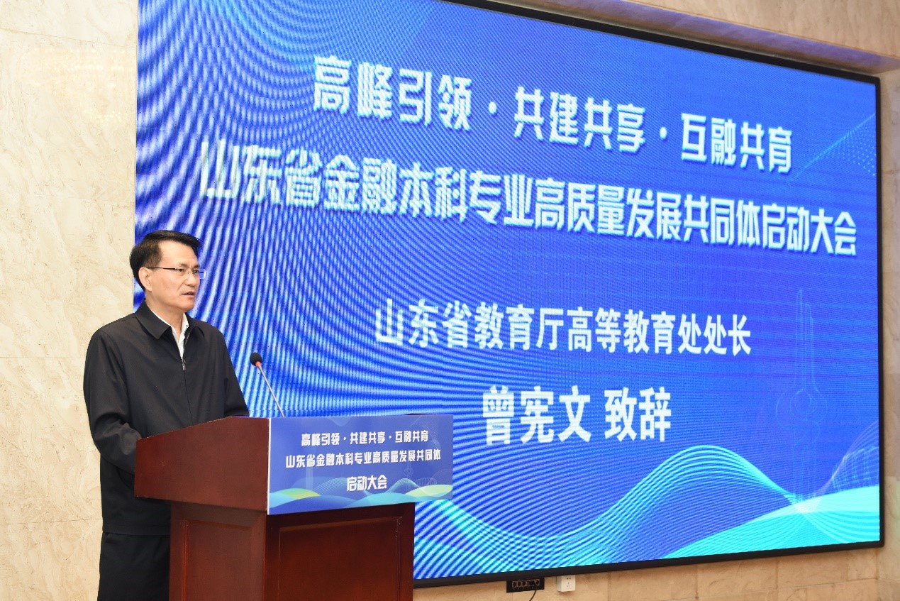 2024年4月25日,“高峰引领·共建共享·互融共育”山东省金融本科专业高质量发展共同体启动大会在济南成功举办。此次会议由山东财经大学主办,黄金娱乐城 承办。中国海洋大学、山东师范大学、青岛大学、济南大学、山东工商学院、临沂大学、山东理工大学、山东管理学院、菏泽学院、烟台南山学院、齐鲁工业大学(山东省科学院)、曲阜师范大学、鲁东大学、青岛科技大学、青岛农业大学、青岛理工大学、山东女子学院、烟台大学、聊城大学、潍坊学院等高校相关学院院长,中泰证券股份有限公司、山东省鲁信投资控股集团有限公司、山钢资本控股(深圳)有限公司等金融机构负责人参加会议。